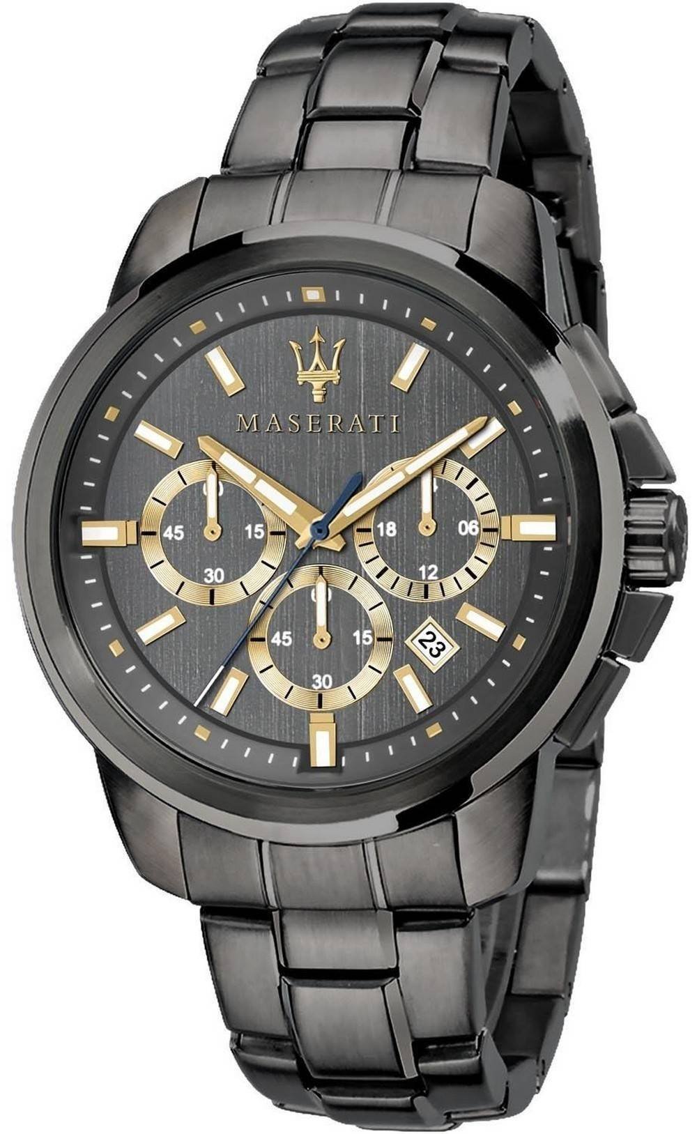 Features: Stainless Steel Case Stainless Steel Bracelet Quartz Movement Mineral Crystal Grey Dial Analog Display Chronograph Function Luminous Hands And Markers Date Display 12/24 Hours Display Pull/Push Crown Solid Case Back Deployment Clasp 50M Water Resistance Approximate Case Diameter: 44mm Approximate Case Thickness: 11mm