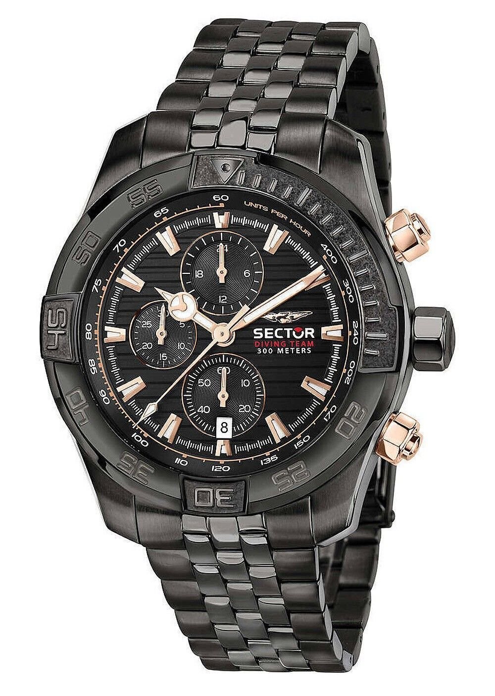 Features: Stainless Steel Case Stainless Steel Bracelet Quartz Movement Sapphire Crystal Black Dial Analog Display Chronograph Function 12/24 Hours Display Luminous Hands And Markers Date Display Screwed Case Back Deployment Clasp 300m Water Resistance Approximate Case Diameter: 45mm Approximate Case Thickness: 13mm